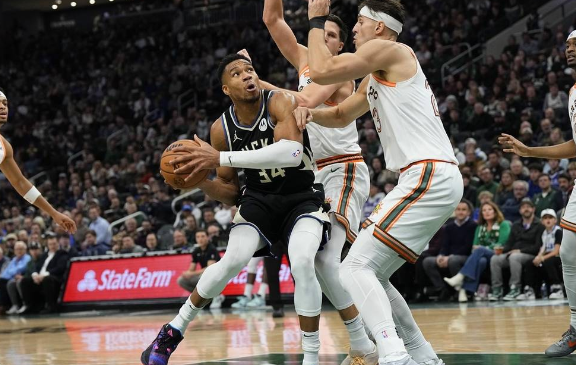 雄鹿队首发:达米安-利拉德、克里斯-米德尔顿、布鲁克-洛佩斯、扬尼斯-阿德托昆博、马利克-比斯利